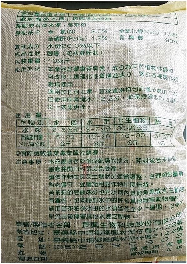 苦茶粕含有豐富的粗蛋白及多種氨基酸等營養物,故對植物成長及根莖發育有顯著的成效,是一種良好的有機肥料。